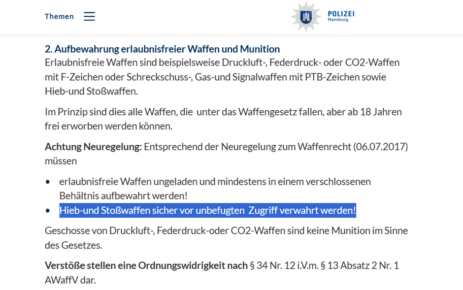 Ein Küchenmesser ist lt. WaffG auch nicht als Hieb- und Stichwaffe definiert. Auch wenn es als solches verwendet werden kann. Andere Messer müssen vor "unbefugtem Zugriff" sicher verwahrt werden. (s.o.)
