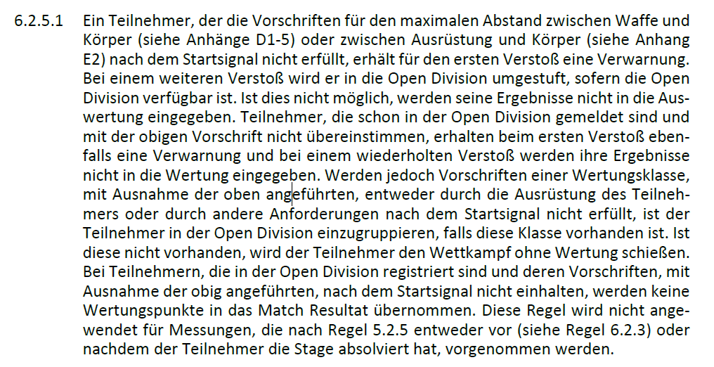 Ab Level III wirst du wieder nach Hause fahren. Speziell auch in Polen habe ich auf den größeren Matches die strengsten und detailliertesten Kontrollen erlebt. Ich hatte auch schon mit dem Magazinschacht meiner Standart Probleme. Der war 45,5 mm statt der erlaubten 45 mm breit. Die haben tlw. keine Zeit zum messen (bei den großen Starterfeldern). Die haben für vieles vorgefertigte Lehren und Boxen, da passen die Teile rein, oder du startest nicht. Bei Level I oder II interessiert das eigentlich niemanden, zumindest meine bisherigen Erfahrungen. -
