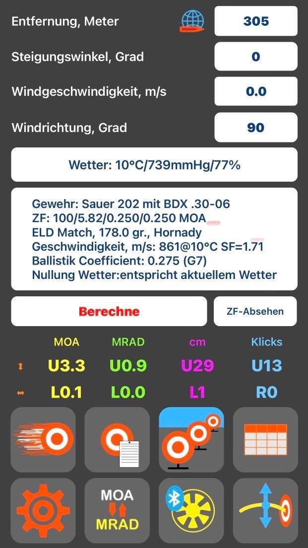 Ganz so ist es nicht, nur .30-06 und das 178grs Hornady ELDM/X ist ja auch nicht so leicht aber natürlich hat es einen guten BC. Klicken muss ich bei dem ZF was bei diesem Setup drauf ist eigentlich auch nicht. Es korrigiert den Haltepunkt von selbst via LRF und Blauzahn. Ich wollte auf das SIG BDX nicht drauf eingehen weil dann immer so komische nachfragen kommen. Es ist ähnlich des Burris. Was viele nicht verstehen ist das man auch bei einem solchen System die Hausaufgaben in Sachen Munition machen muss. Im grunde ist es nichts anderes wie ein normales ZF man braucht nur die Klicks nicht selber einstellen sondern die Elektronk übernimmt das. Das führt auch zu weniger Fehlern (kann) Ich hab aber auch wahlweise ein Meopta 4-20x44 da drauf. LL ist übrigens 60cm. Das BDX korrespondiert auch mit dem Kestrel. Es kann auch den Seitenwind korrigieren. Ich habe in aufwendigen Test die Pulvertemperatur gemessen, indem ich einen Sensor in die Patrone gesetzt habe. Hab dann diese als Referenz genutzt und dann bei verschiedenen Temperaturen die V0 gemessen. Dadurch hat Kestrel aber auch Strelok eine Table die danndie V0 berücksichtigt. Kleiner Spoiler nach 45 min hat die Patrone eh die selbe Temperatur wie aussen. Interessant ist noch wie schnell sich die Patrone erwärmt wenn sie im heissen Lager steckt. Mehr wie 5 Sec würde ich die nicht drinnen lassen.