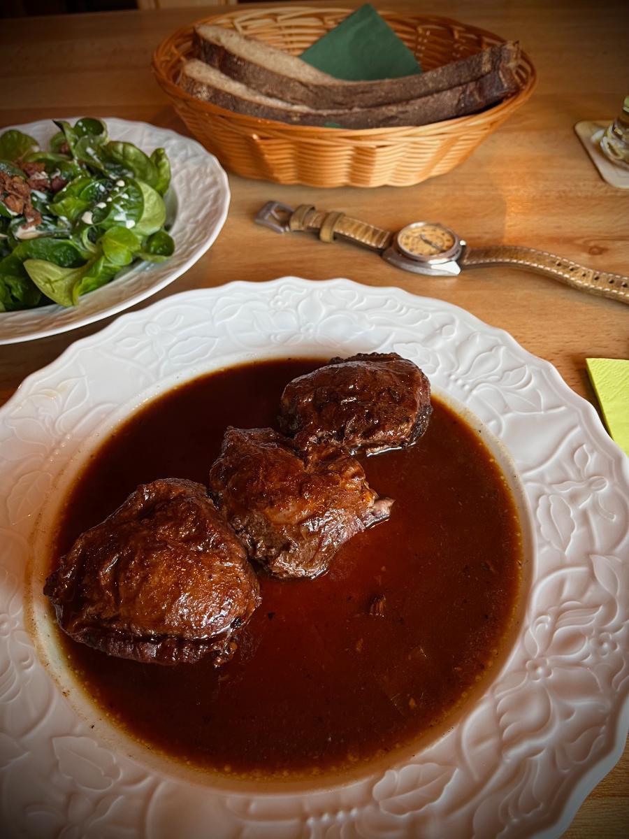 Aber nach dem Lesen der vollständigen Speisekarte, habe ich mich dann gegen das Zigeuner Schnitzel entschieden und stattdessen geschmorte Schweine Bäckle in Rotweinsoße bestellet.